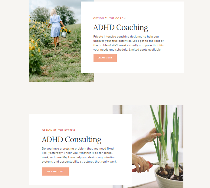 You can add a subheadline (e.g., ADHD coaching for adults) and subtext (e.g., intensive life…) as seen in her copy for context and keyword optimization.